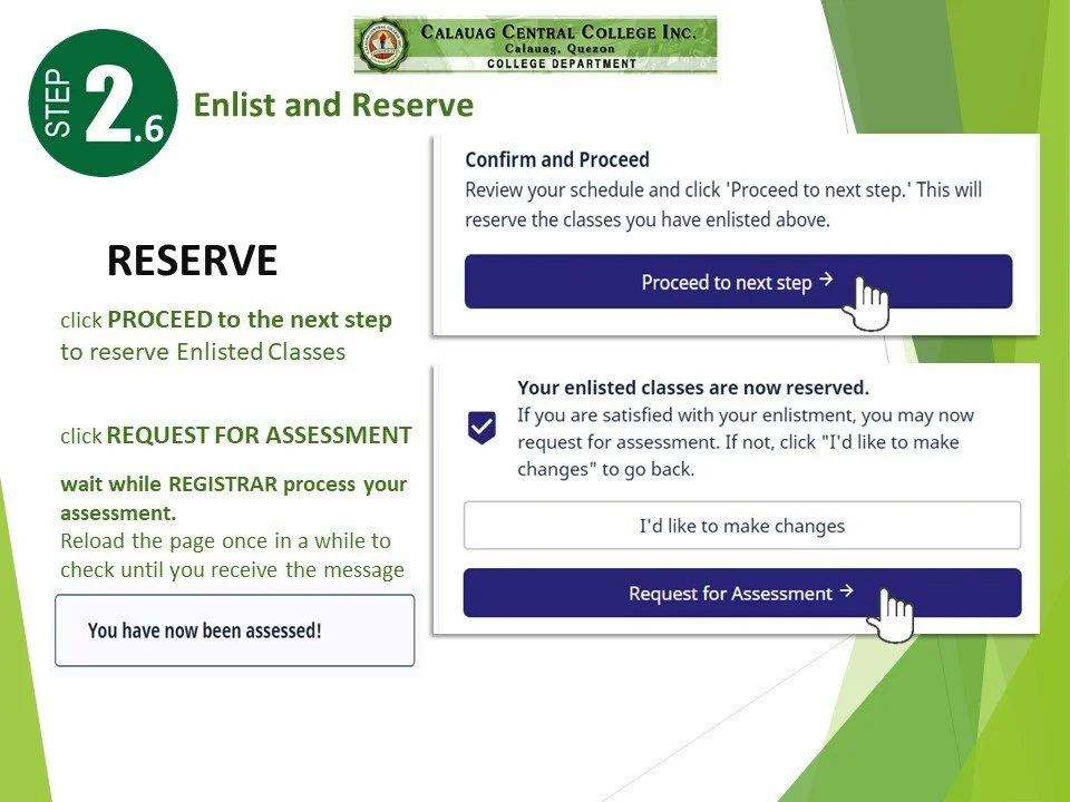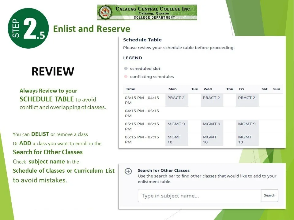 For Non-regular Students: You could either “Find a class” to enlist or “Search for other classes” if not listed.Review your Schedule Table to avoid conflict or overlapping classes.