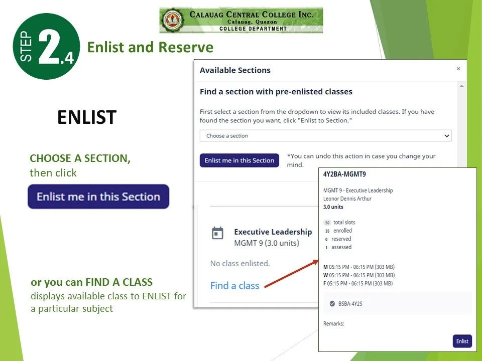 For Regular Students: Click “Find section with pre-enlisted classes” and select a section to enlist