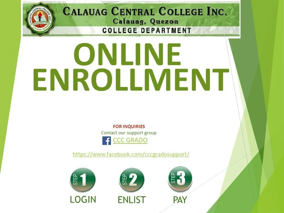 This is to inform you that GCASH payment is now accepted, send a screenshot of the confirmation to CCC Facebook page. The school will accept also accept ON-SITE payments from 8:30 AM to 12:00 PM. Prior to payment, make sure that your ONLINE ENROLLMENT REQUEST is duly APPROVED and marked "ASSESSED" by the GRADO administrator. We apologize for any Inconvenience and rest assured that we are making all the possible means to ensure that all students will be able to enroll this semester.